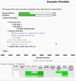 - Optional items (which can be hidden in the class progress report and contribute to a secondary ‘all items’ progress bar)