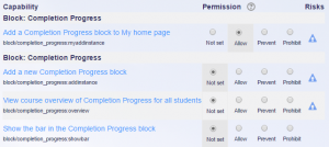 Controls whether the Completion Progress block can be added by a user to the Dashboard (formerly My home) page. By default, this is allowed for all authenticated users. - Add a new Completion Progress block (block/completion_progress:addinstance)