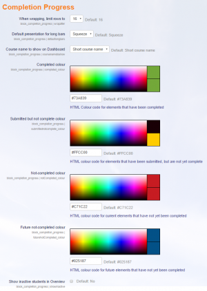 The Completion Progress block has a number of global settings that will be seen on installation and can be accessed later at Site administration > Plugins > Blocks > Completion Progress.