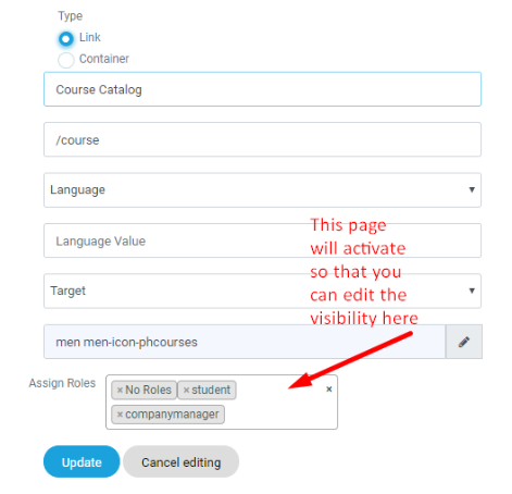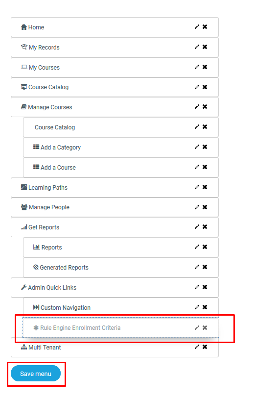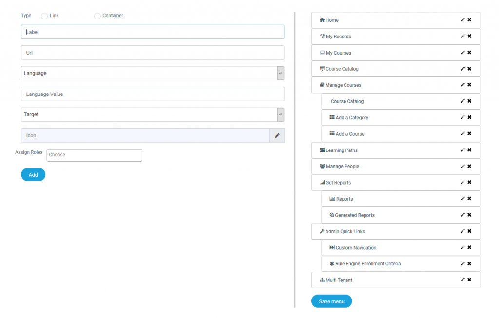 PLMS Custom navigation feature allows you to create new navigation options for your end users as well as setup the visibility based on specific roles. For example, you can limit the visibility of the “Course Catalog” to only site admins and teachers but not students. You can also create quick links for site admins or any role with permissions to access a specific admin page.