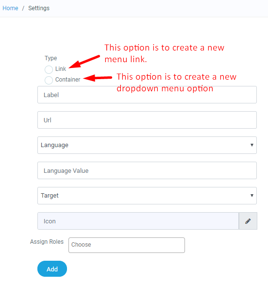 In the custom navigation page, fill out the form in the left side of the page. Start with selecting the type of menu you want to create. If you select “Link”, it will create a new menu option. If you select “Container” it will create a new drop-down menu option.
