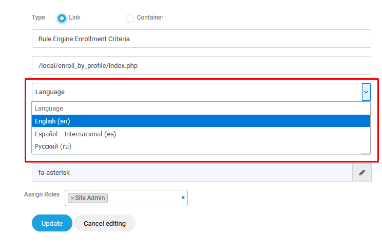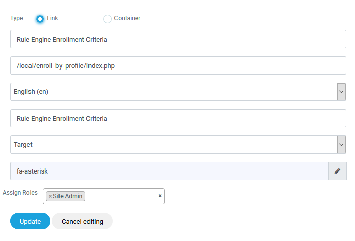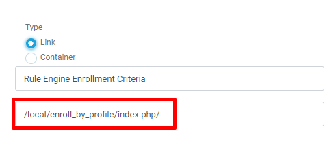 Then add the URL link. The links are URL inside the LMS. For example, if you want to create a direct link to the “rule engine” configuration page, you will have to add the highlighted part of the URL here: