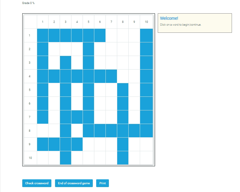 This game takes words from either a Glossary or quiz short answer questions and generates a random crossword puzzle. The instructor can set the maximum number of columns/rows or words that it contains. Learners can press the button “Check crossword” to check if the answers are correct. Every crossword is dynamic so it is different for every user.