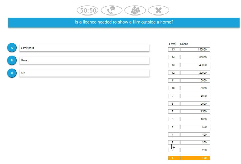 The rules of the Millionaire game are simple: you must answer each question correctly to proceed – if you answer one question wrong, the game is over. Look in the bottom-right corner of your screen to see if you answered the question correctly or not.