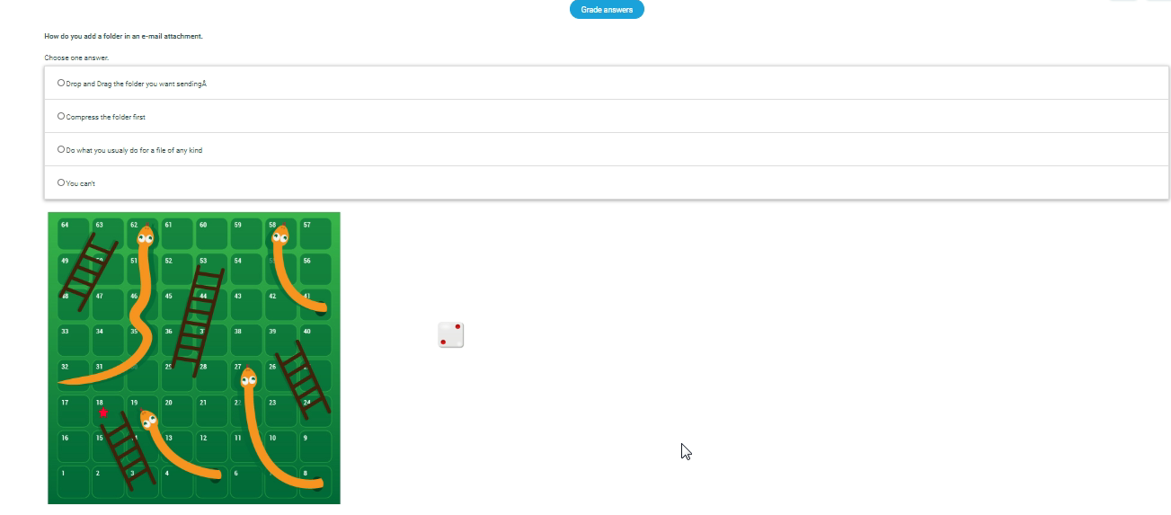 The students have to traverse a traditional “Snakes and Ladders” board by answering questions taken from either a Glossary or quiz short answer questions. As they get an answer right, the dice is rolled and a random number displayed. The game piece is moved ahead of that many squares. If the game piece is in the bottom of a ladder and the answer is correct, it goes to the top. If the game piece is in the head of the snake and the answer is wrong, it goes to the tail.