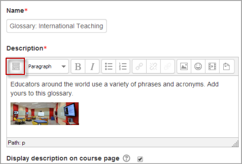 Describe the purpose of the glossary and provide instructions or background information, links etc. Click the icon to the top left of the editor to expand the toolbars, and drag the bottom right of the text box out to expand it.
