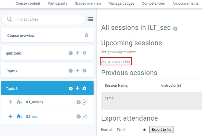 ILT stand for Instructor-led training. Using this activity user can create a session where the teacher can have a classroom(offline) meeting with enrolled students in course.
