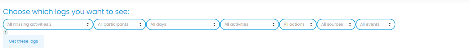 To generate a log, select any combination of group, user, date, activity, actions, and level, then click the “Get these logs” button. Click the “?” icon for more information.