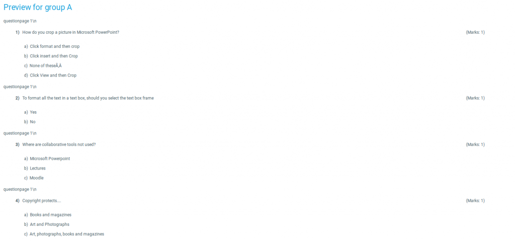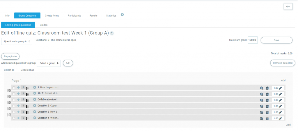 The module supports up to six groups which are not related to LMS course groups. Each group can contain a different set of questions in a different order. Separate question sheets and answer forms are created for the different offline quiz groups.