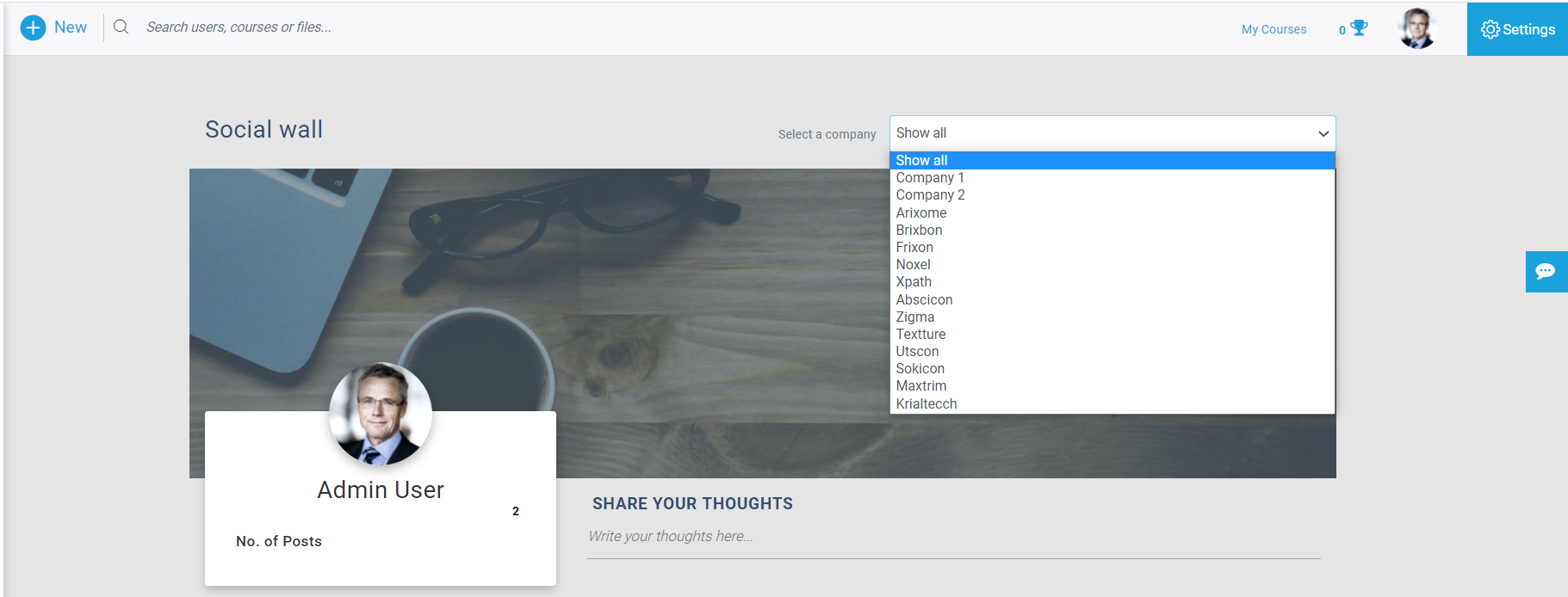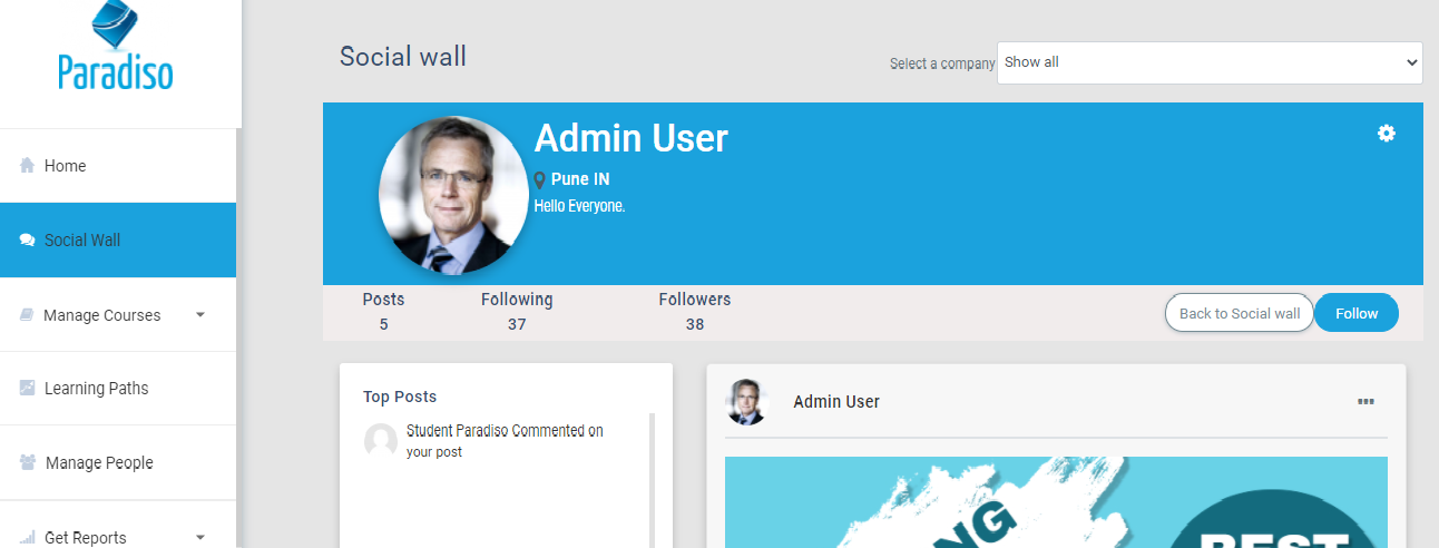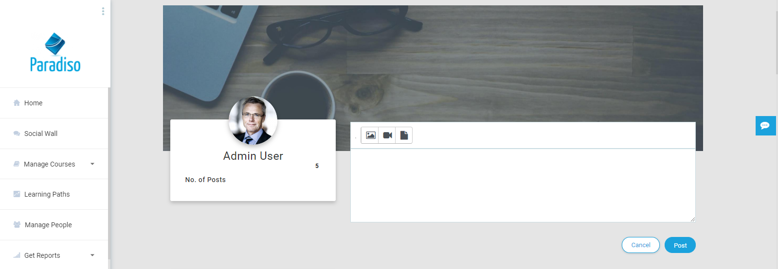 Social wall is a feature on LMS where users can share their learnings and experiences using this platform. Users can create posts on the social walls where these can be viewed throughout LMS user logins. This post can be created by users, managers as well as admin. Users can add content to post by using images, videos, and document files. Text content can be added using a text editor box where users can also provide different links. The social wall will help to improve communication between users across LMS.