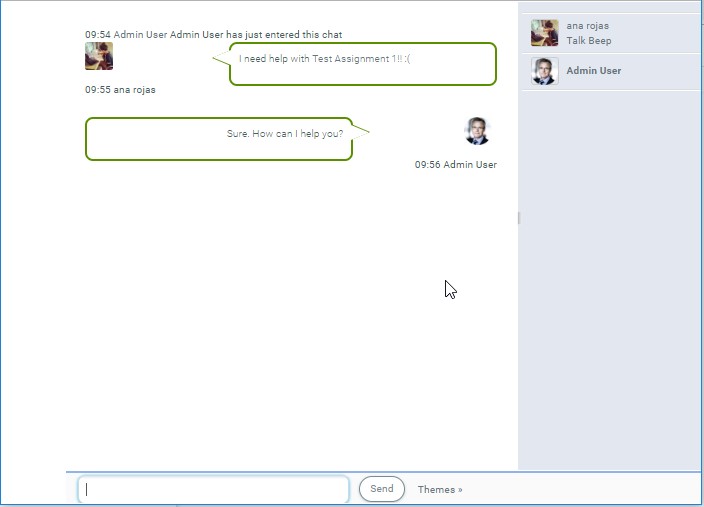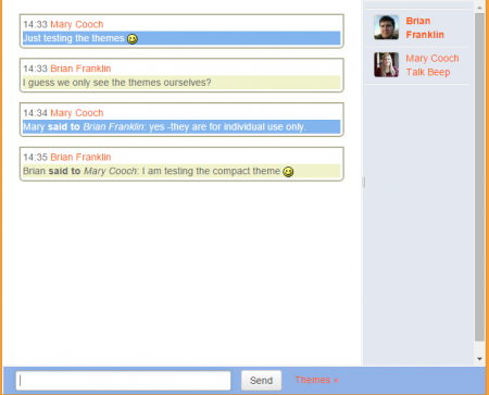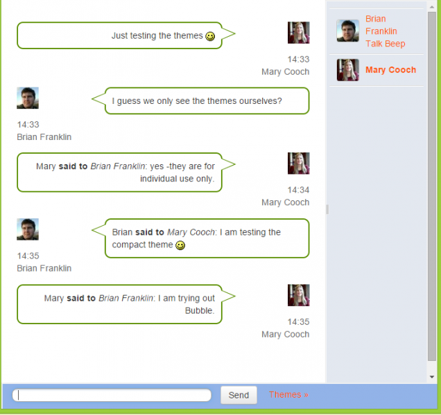 - Users can change the appearance of the messages by clicking on “Themes” next to the “Send” button. Alongside the default course theme, there are two other available themes. ‘Bubbles’ looks like this: