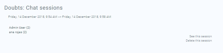 - This will bring up a listing of each chat session under the current chat topic. The listings include the time the chat started and ended, which users participated, and how many messages each user sent. Individual sessions may be deleted by clicking the ‘Delete’ link.