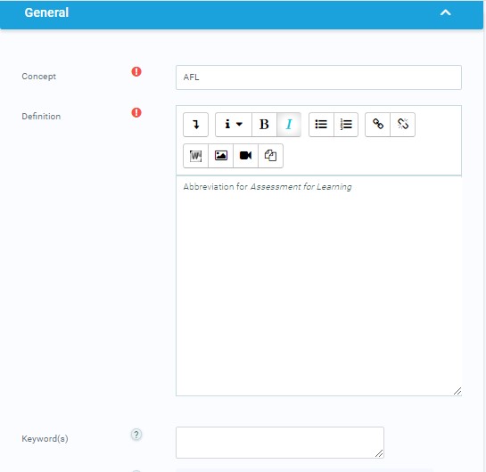 - Keywords – Each glossary entry can have an associated list of keywords (or aliases). If the entry is auto-linked (see below), then any keywords will also be auto-linked. Enter each keyword on a new line (not separated by commas).