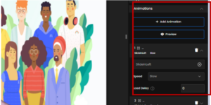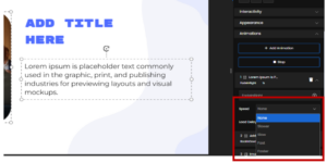To add an animation, first select the element and move to the right drawer. Under the dropdown animation section, click on add animation. From here, you can choose the animation type, set the speed, and define the delay or duration according to your requirement.