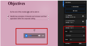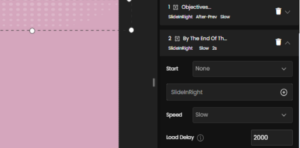 There is a Load Delay option which specifies the time at which animation is going to appear on the screen. The value entered is measured in milliseconds, where 1000 milliseconds equals 1 secondExample, if you set the delay to 2000, the animation will begin 2 seconds after the slide loads.