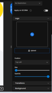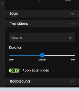 In the right drawer, you’ll see the Logo section, followed by the Transition and Background drop-downs. Each of these has its own set of editing properties underneath.