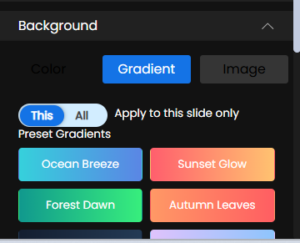 In the Background drop-down, which offers options: Color, Gradient, and Image. Starting with Color, you have a wide range of color options to choose from. As with transitions, you can toggle the option to apply the background color to just this specific slide or to the entire course. For the Gradient option, you have pre-set gradient styles to choose from. Additionally, there are two options to customize your own gradient, allowing you to pick specific colors and create your unique gradient variant. You can also control the direction of the gradient. Furthermore, there’s an option to adjust the opacity of your gradient, giving you full control over its appearance and blending with other elements on your slide.