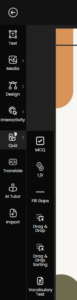 To insert any quizzes into the courses, navigate to the left panel and open the Quiz drop-down menu. You will see multiple quiz formats available, including Multiple Choice Questions (MCQ), True or False, Fill in the Gaps, Drag-and-Drop, Drag-and-Drop Sorting, and Vocabulary Test.