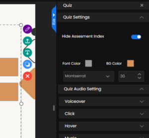 Once you navigate to Quiz Settings by clicking on the drop down. The initial option is Hide Assessment Index, which you can enable using the toggle to hide the assessment index displayed above your quiz. You can also customize the appearance by changing the font color, adjusting the background color behind the text, selecting your preferred font, and setting the font size.