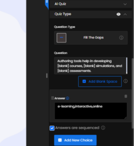 You can add Fill the Gaps quiz type, you can manually enter your question and insert blanks wherever needed. To do this, click the Add Blank Space button, and a blank field will automatically appear within the text. Below, you can enter the correct answers in the required sequence and enable the Answer in Sequence option to ensure learners fill the blanks in the proper order. Once complete, click Update Question to save your changes.
