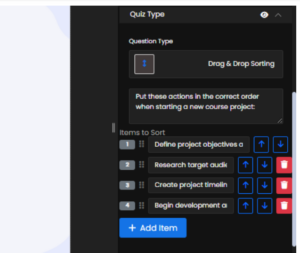 In the Drag-and-Drop Sorting drop-down, you can enter your question and list the answers in the correct sequence. Additional items can be added as needed. Once done, click Update Question to save your edits. During the quiz, learners can sort the items by dragging them up or down. Correctly placed items will be marked as correct, while items in the wrong order will be marked as incorrect.