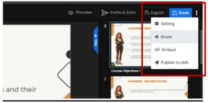 Once the course is created, click on the three dots at the top right in the course editor, next to ‘Save.’ Upon clicking, you’ll see four options: Settings, Share, Embed, and Publish to LMS.
