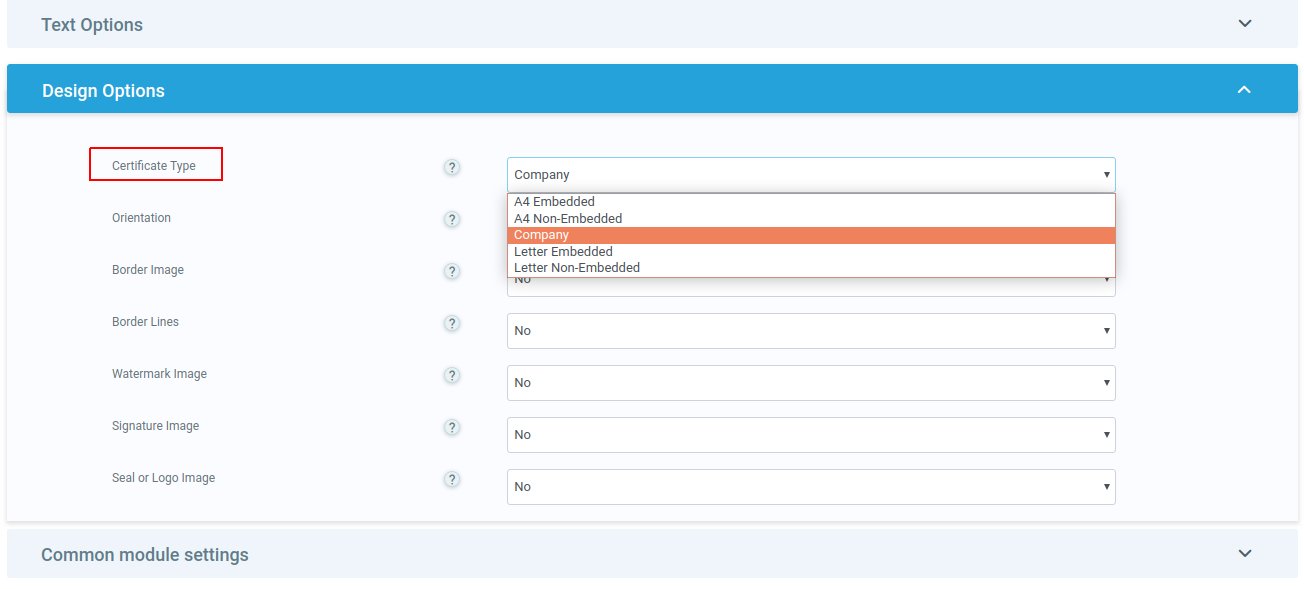 - Look certificate type in design options block and select company from drop-down followed by saving changes.