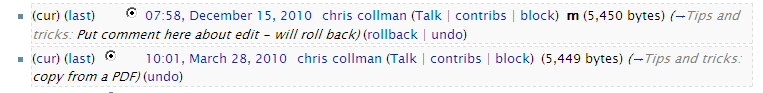 It is also possible to revert (roll back) an edit to a previous version from this tab. Usually rollback are left to the LMSDoc Sysops (administrators), but you certainly can rollback your recent edits. Hopefully, both LMSDoc sysops and you will comment why the rollback was performed.