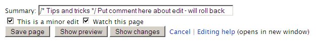 Before saving the page, it’s considered good practice to enter a very brief summary of your changes in the summary box below the edit-box.