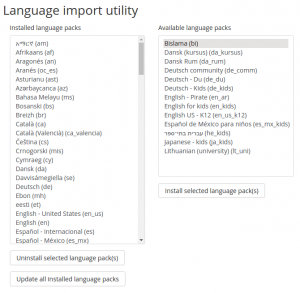 Over 100 language packs are available for an administrator to install on your LMS site in ‘Language packs’ in the Site administration. Simply select the languages you require from the list of available language packs and click on the “Install selected language pack” button.