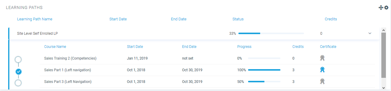 From the Learning Path Dashboard block, users can see the next information related to their learning paths: