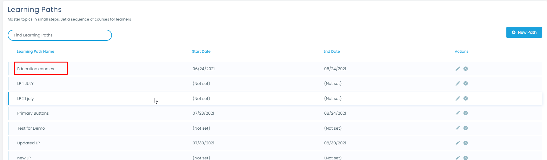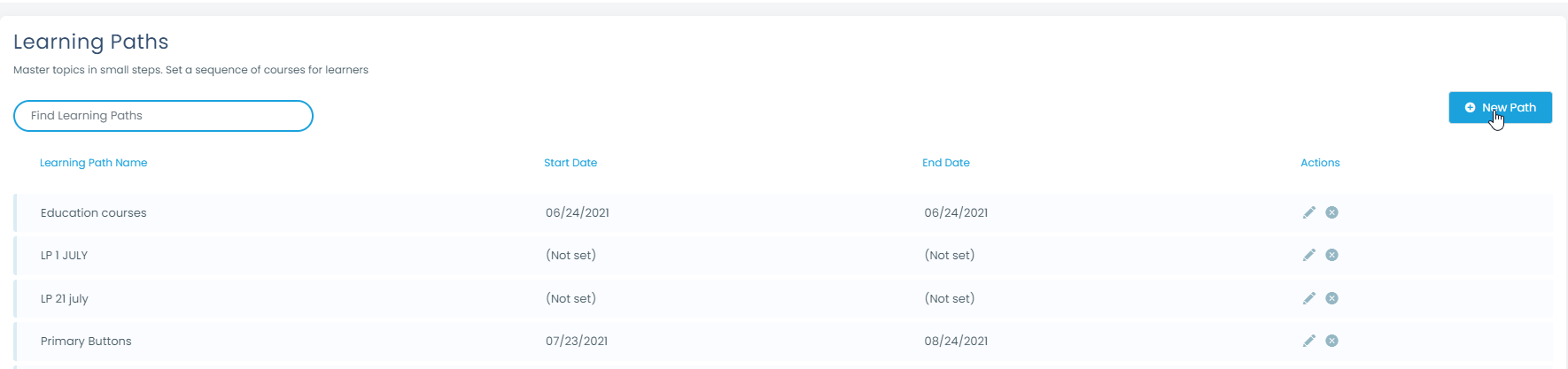 You will be redirected to the Landing page. In that section, you can delete, edit, and search for existing learning paths. There is also a button with a plus(+) icon that allows you to add a new learning path.