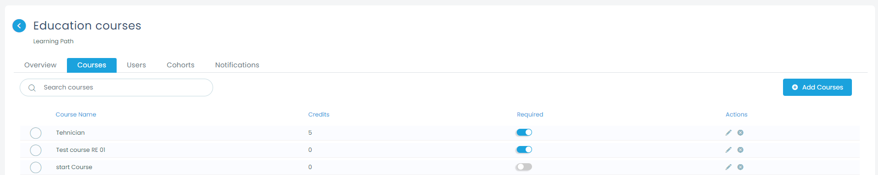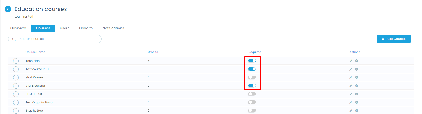 On the list of selected courses within the learning path, you can click on the switch from the column “Required” to set this course as mandatory within the learning path.