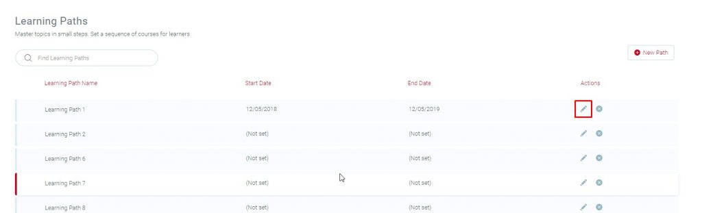• Go to Learning path Landing page and select a created learning path to add the course.