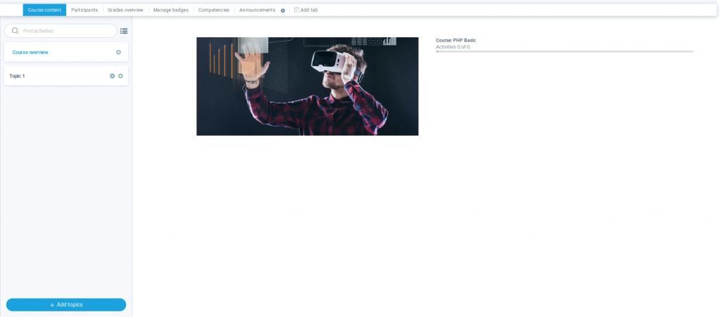At any time, only course overview which has course details and image will be visible. The topic/section panel will be in collapsed mode by default. The user can view the content by clicking on the corresponding topics/sections.