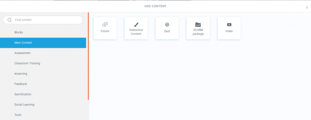 • Add important content, gamification, classroom training, feedback, social learning, and different tools in the top panel of the course