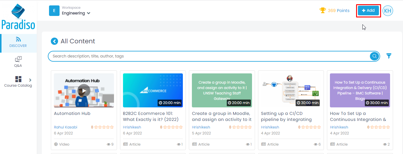 • Learning pathways/Playlists: The learners’ digital music libraries and streaming platforms, you’d see their content organized into themed playlists. The multimedia content in LXP (such as videos, articles, podcasts, and traditional eLearning courses) can be organized into themed playlists, including role-specific content, product-specific content, or content targeting certain learning populations. Playlists can be created by an admin or even by the learners themselves, and can be public or private based on the creator’s settings. Rock on!