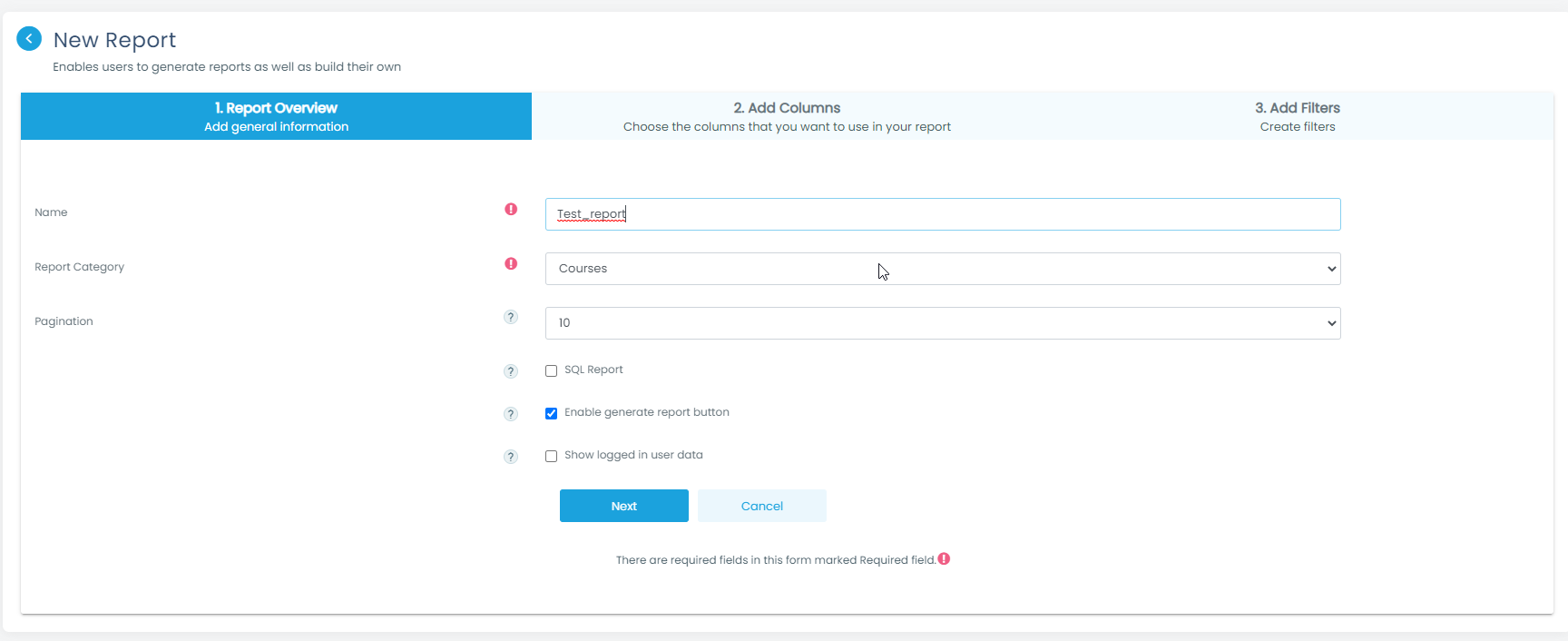 • Enable generate report button: if you want your report to have the option to be able to be downloaded as a CSV file, it is necessary to enable this option.