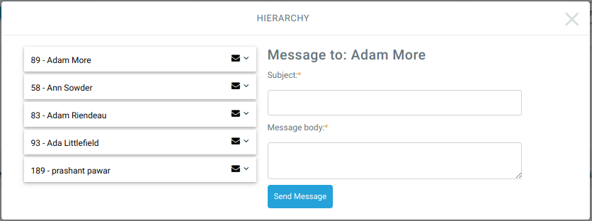 To send a message to a user you have to click on message icon. After clicking on the message icon you will get the option of Subject and Message body through which you can be able to send the message to the users of Hierarchy.