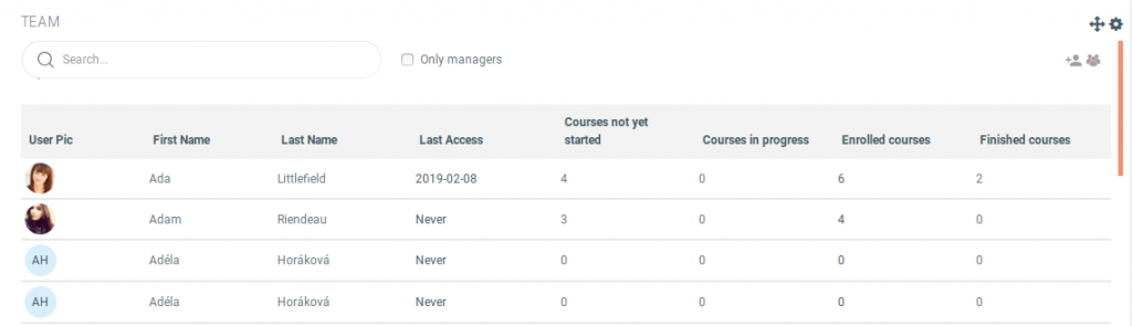 Each member’s record shows their number of Courses not yet started, Courses in progress, and Finished courses. Clicking on a number will redirect you to a list of that user’s courses in that topic. For users who manage several sub-managers or supervisors, each with their own team, there is a search bar to quickly filter teams, based on the team leader’s name.