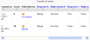 The interactions report may be downloaded in ODS, Excel or text format and include responses, right answers and results (whether the response to a question was right or wrong).