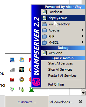 Once wampserver is installed you will see a W icon, either on your desktop, start menu or taskbar (according to what you selected when installing.) Click it to bring up its options and then click PhpMyadmin as in Screenshot A below.