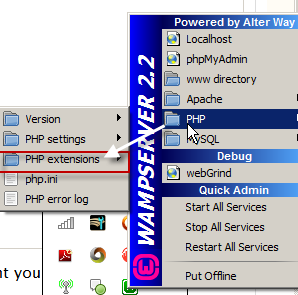 2. Click your W wampserver icon and click “php extensions” (screenshot 1 below)