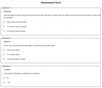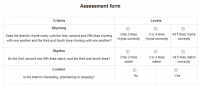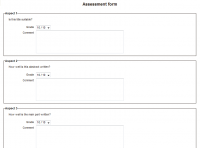 In this case, the assessment form consists of a set of criteria. Each criterion is graded separately using either a number grade (eg out of 100) or a scale (using either one of site-wide scale or a scale defined in a course). Each criterion can have its weight set. Reviewers can put comments to all assessed criteria.