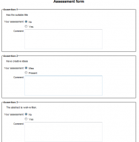 The assessment form is similar to the one used in accumulative grading strategy but no grades can be given, just comments. The total grade for the assessed submission is always set to 100%. This strategy can be effective in repetitive workflows when the submissions are firstly just commented by reviewers to provide initial feedback to the authors. Then Workshop is switched back to the submission phase and the authors can improve it according to the comments. Then the grading strategy can be changed to another one using proper grading and submissions are assessed again using a different assessment form.